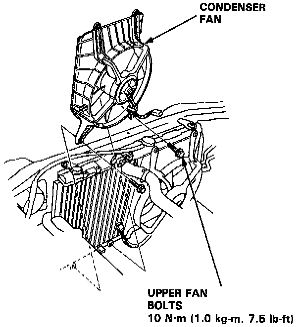 11. Disconnect the condenser fan connector, then remove the lower mounting bolts and the condenser fan.