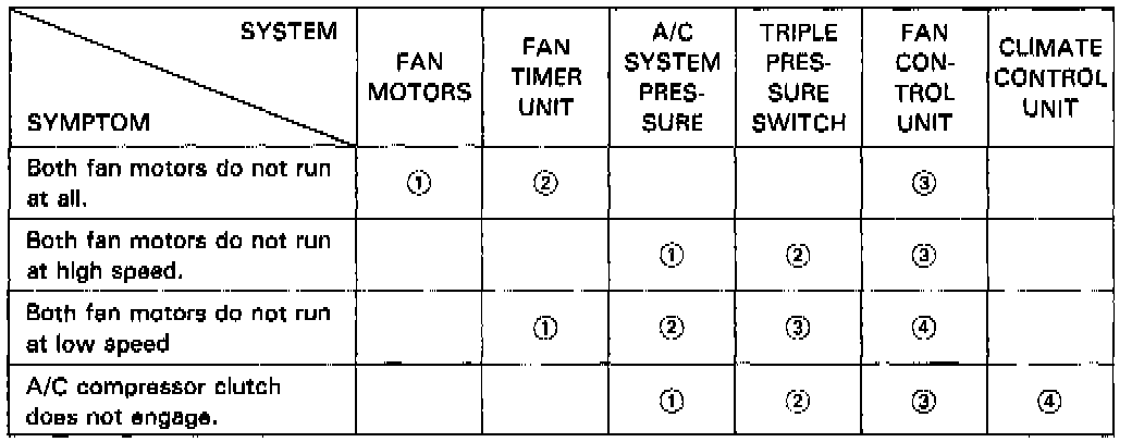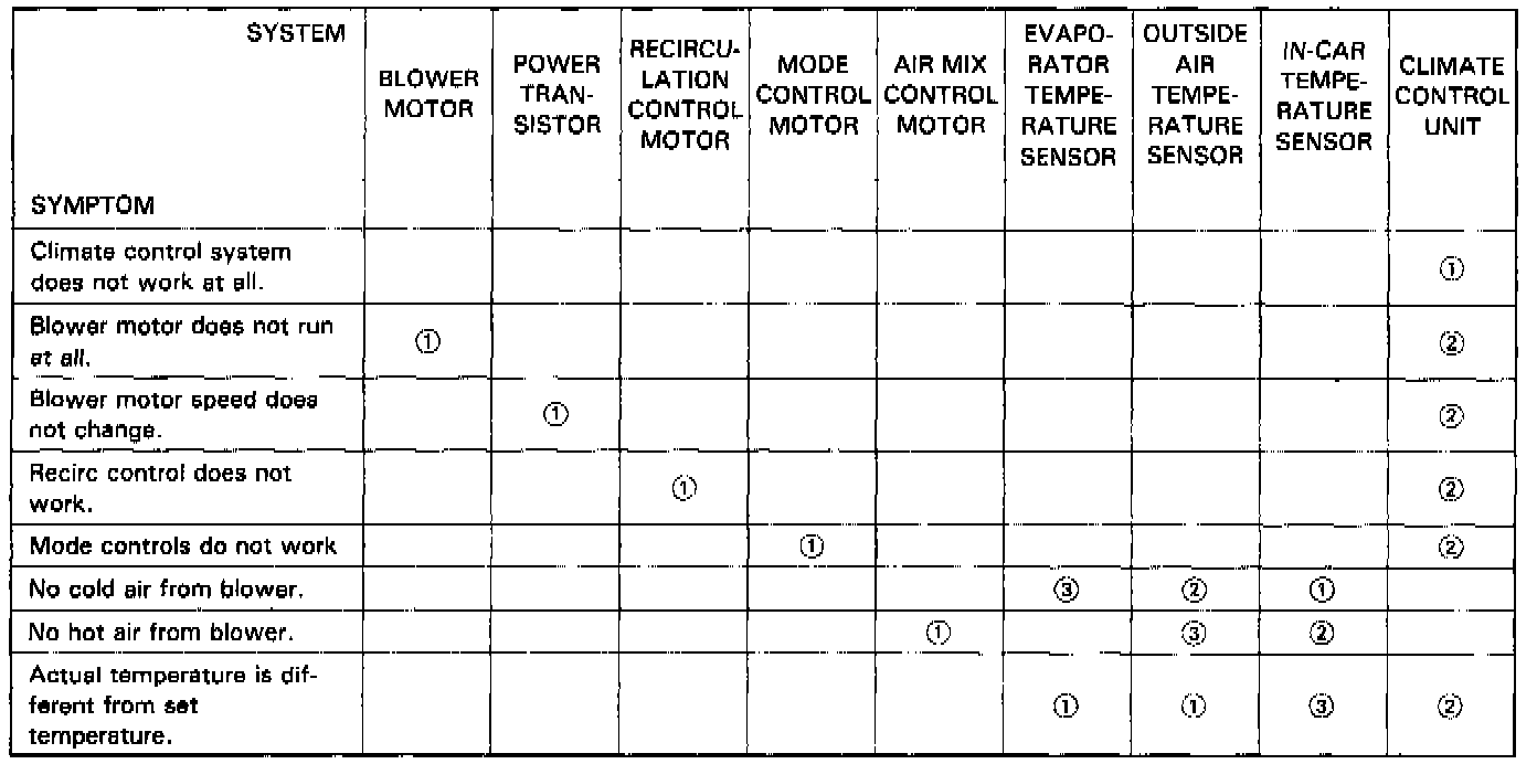 - Across each row in the chart, the potential sources of a symptom are ranked in the order they should be inspected, starting with [1]. Find the symptom in the left column, read across to the most likely source, then refer to the component or diagnostic flowchart listed at the top of that column. If inspection shows the component is OK, try component [2], etc...