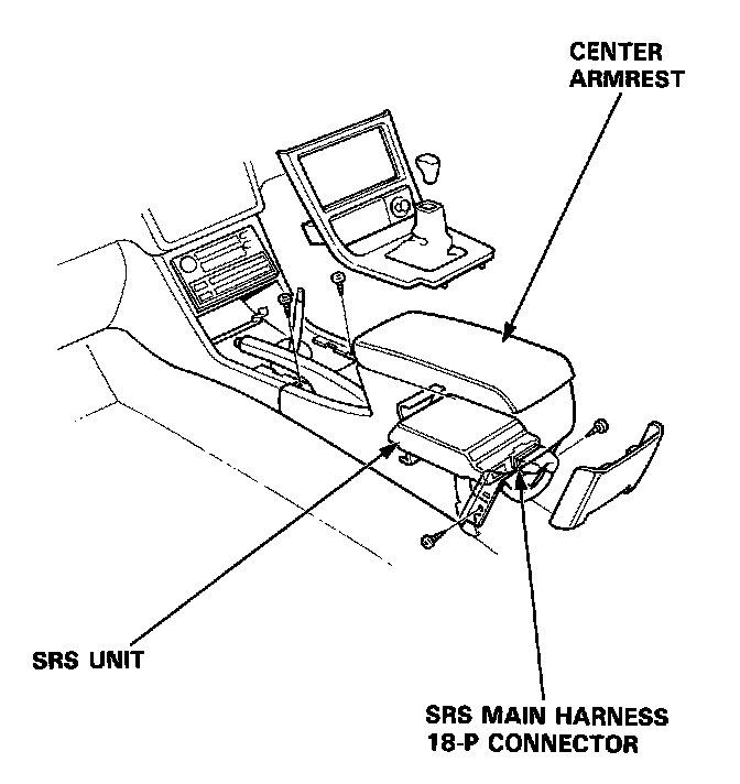 3. Remove the center armrest, then disconnect the SRS main harness 18-P connector from the SRS unit.