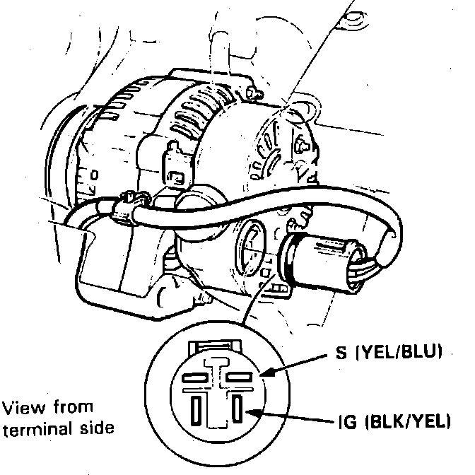 4. Turn ignition switch on and ensure battery voltage exists between alternator connector black/yellow wire terminal and ground, and between yellow/blue wire terminal and ground, Fig. 7. If no voltage exists, check for blown fuse No. 9 on 1989-90 models or fuse No. 15 on 1991-92 models, or open in black/yellow or yellow/blue wires.