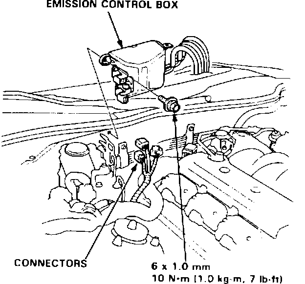 2. Disconnect the three connectors, then remove the emission control box from the bulkhead. (Do not disconnect the vacuum hoses.)