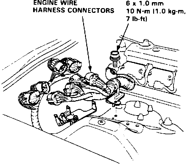 4. Disconnect the four engine wire harness connectors and unbolt the harness clamp. Disconnect the three solenoid/pump connectors.