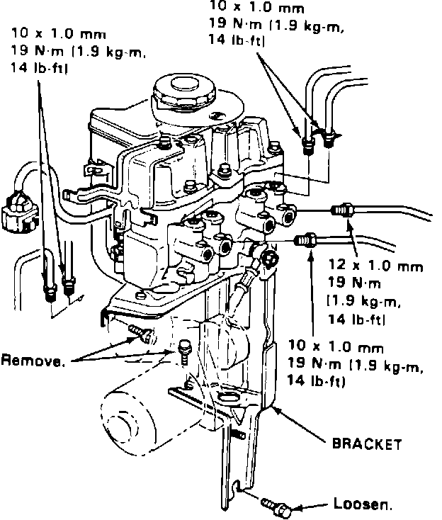 9. Loosen, but do not remove, the lower modulator bracket mounting bolt. Remove the two upper modulator bracket mounting bolts, then lift the modulator unit, power unit, and bracket out of the car as an assembly.