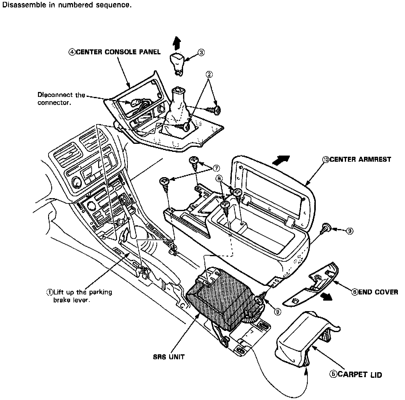 CAUTION: Be careful not to damage the SRS wire harnesses when servicing the center console panel and center armrest.