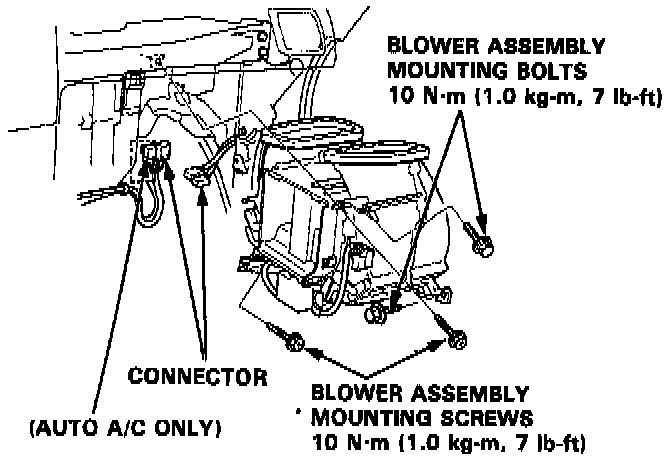 BLOWER ASSEMBLY REPLACEMENT1. Remove the dashboard lower panel and disconnect the connector from it.
