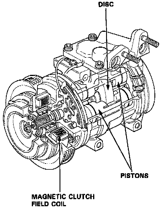 The compressor is a Nippondenso piston type. A revolving inclined disc drives the surrounding 10 reciprocating pistons. As the inclined disc revolves, it pushes the pistons, protected by a ceramic shoe, thus compressing the refrigerant.