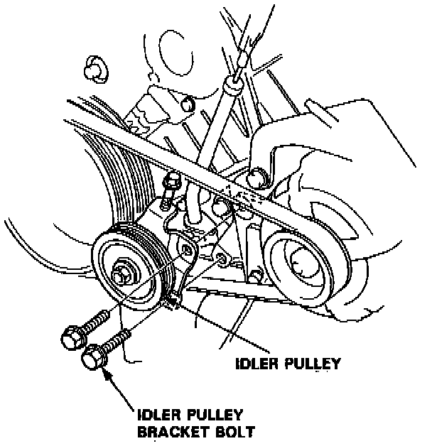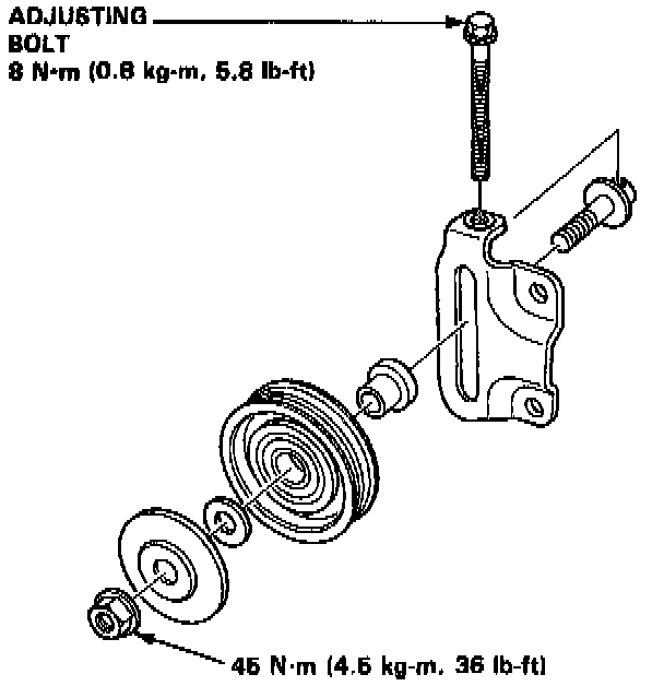 6. Loosen the idler pulley center nut and adjusting bolt, then remove the belt from compressor.
