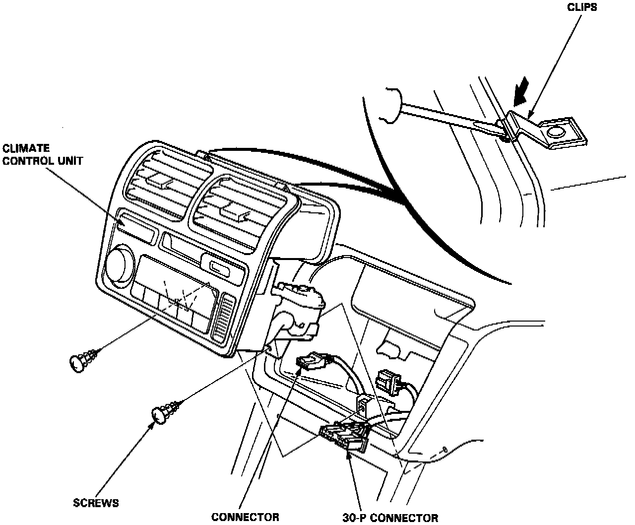 3. Remove the climate control unit assembly by pushing the clips down as shown.