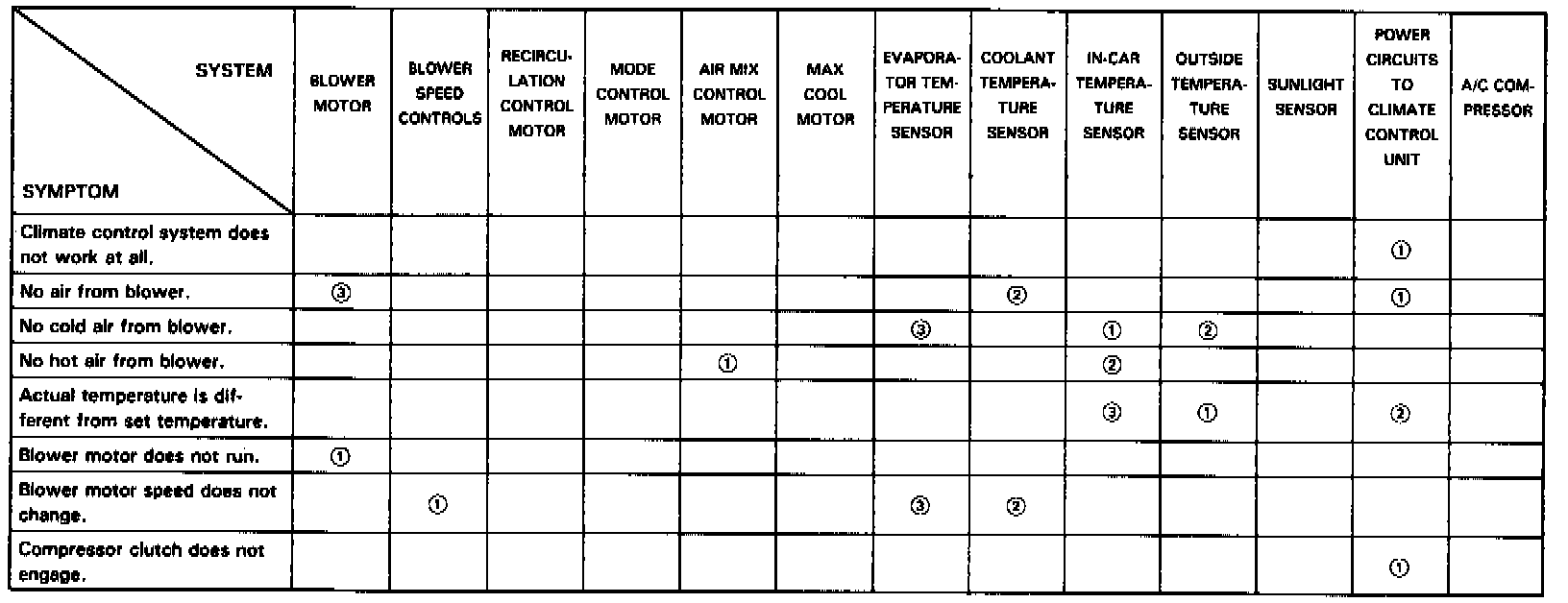 - Across each row in the chart, the potential sources of a symptom are ranked in the order they should be inspected, starting with [1]. Find the symptom in the left column, read across to the most likely source, then refer to the component or diagnostic flowchart listed at the top of that column. If inspection shows the component is OK, try component [2], etc..