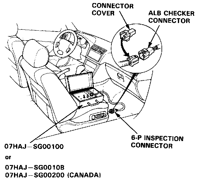 1. Disconnect the 6-P inspection connector from the cross-member under the passenger's seat and connect the inspection connector to the ALB checker.