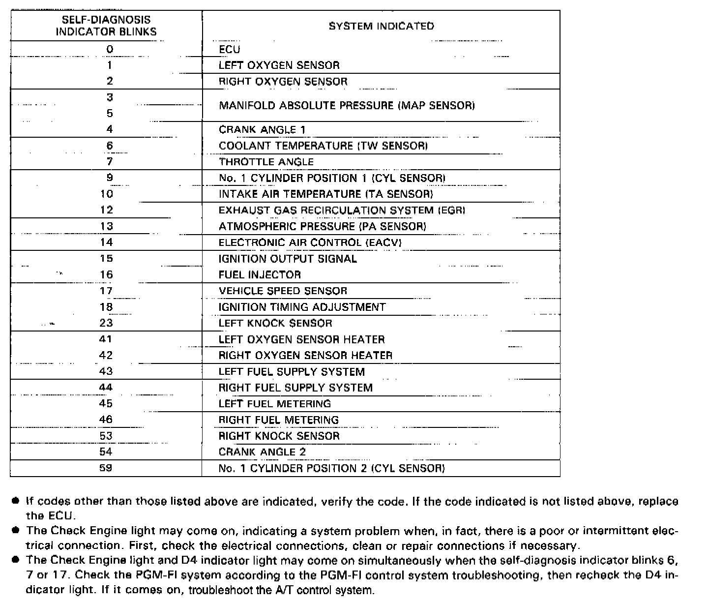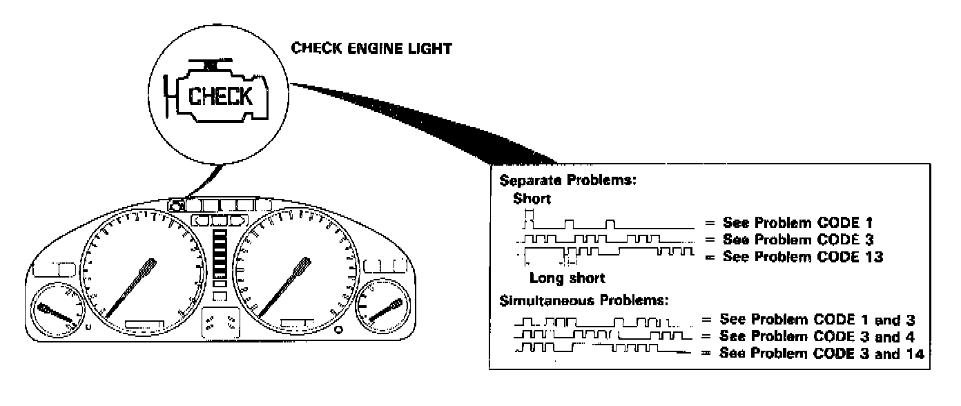 2. Note the CODE: the Check Engine light indicates a failure code by blinking frequency. The Check Engine light can indicate simultaneous component problems by blinking separate codes, one after another. Problem codes 1 through 9 are indicated by individual short blinks. Problem codes 10 through 59 are indicated by a series of long and short blinks. The number of long blinks equals the first digit, the number of short blinks equals the second digit.