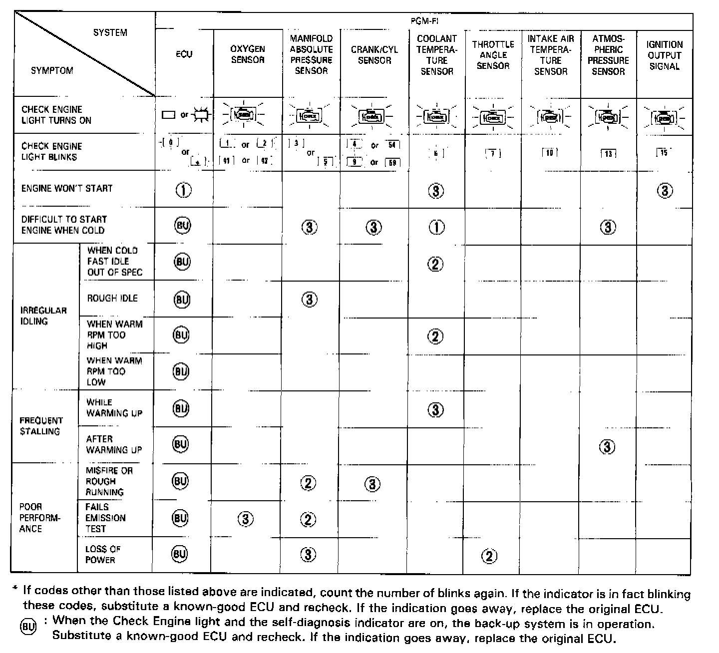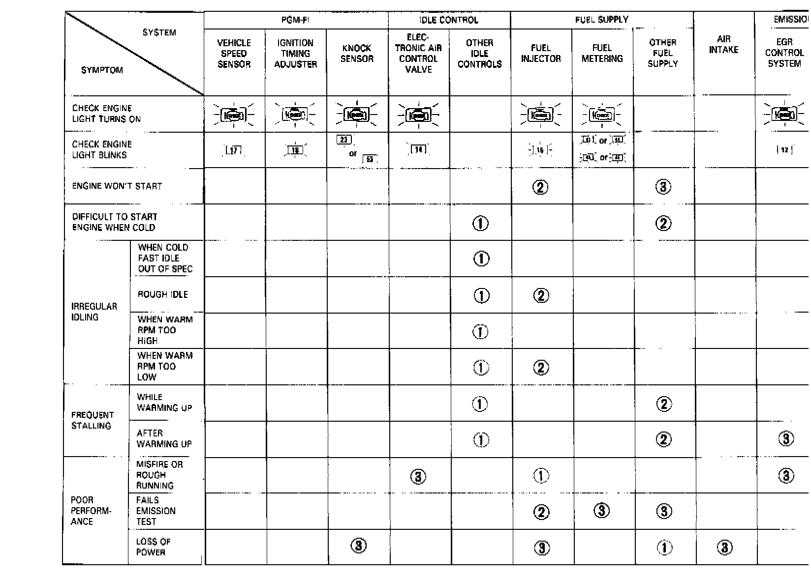 NOTE: Across each row in the chart, the sub systems that could be sources of a symptom are ranked in the order they should be inspected, starting with (1). Find the symptom in the left column, read across to the most likely source. If inspection shows the system is OK, try the next system (2), etc.�ـ#: