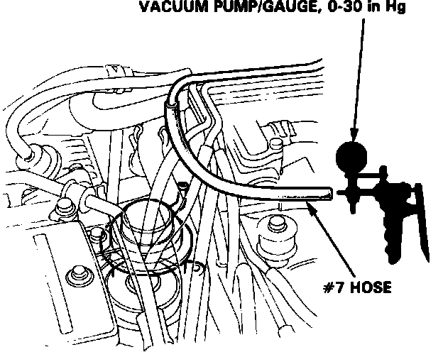 6. If bubbling sound is not heard, disconnect #7 vacuum hose from the top of the air suction valve, attach a vacuum gauge, and check for vacuum within 10 seconds after restart.