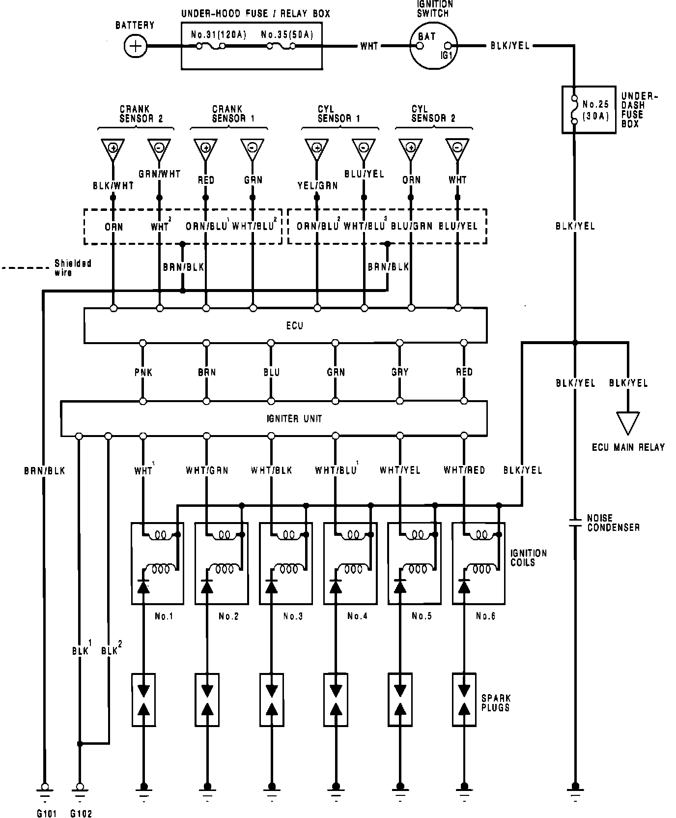 NOTE: Several different wires have the same color. They have been given a number suffix to distinguish them (for example WHT1 and WHT2 are not the same).