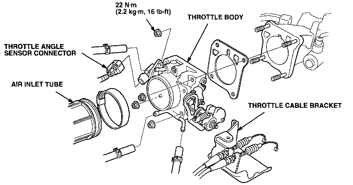 10. Install the throttle body with a new gasket. Tighten the mounting nuts to 22 Nm (2.2 kg-m, 16 lb-ft).