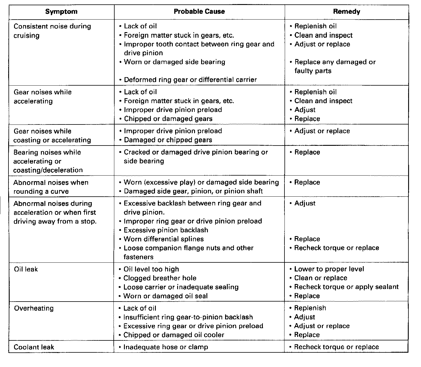 NOTE: Most problems in the unit are to be diagnosed by identifying noises from the gears or bearings. Care should be taken during diagnosis not to confuse differential noises with those from other drivetrain components. [Noise symptoms will be most prominent]