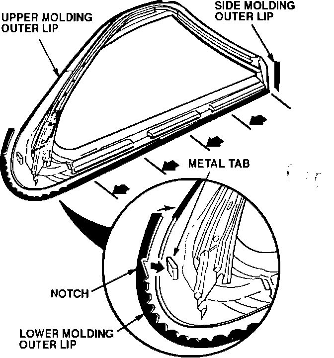 If the rear quarter window molding outer lip is missing, replace it with the new parts listed under PARTS INFORMATION. Use the following procedure to attach the new lip or reattach the existing lip.