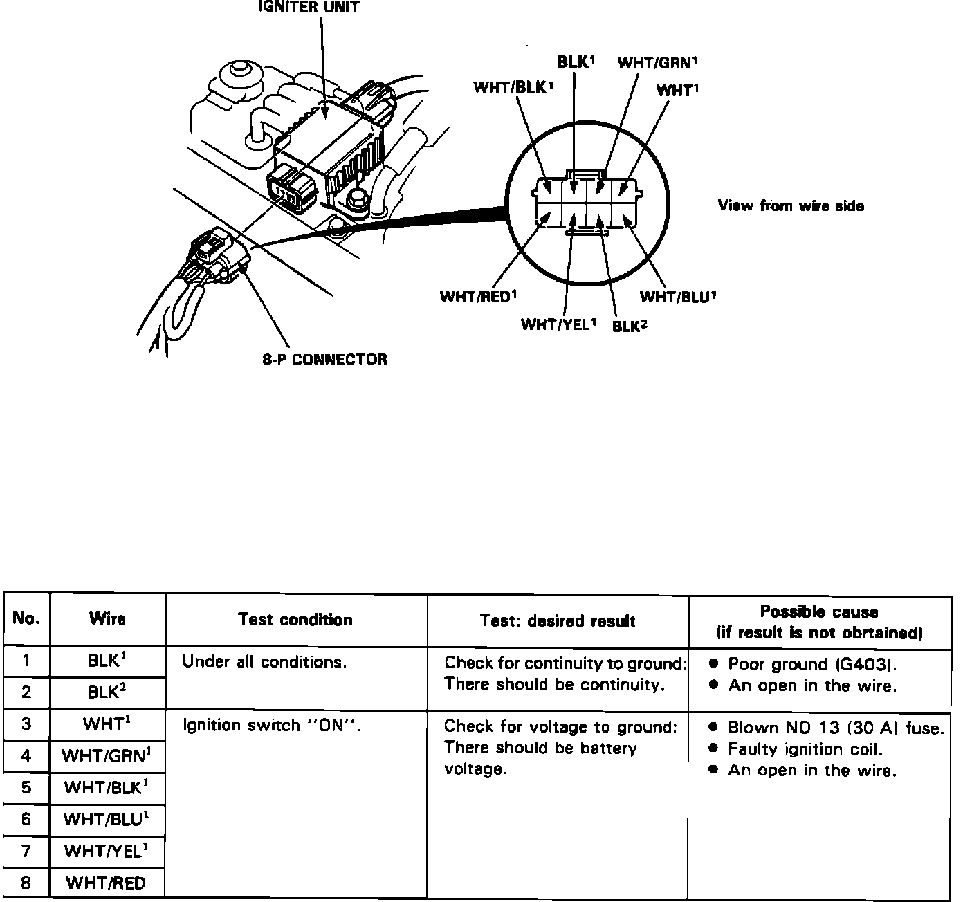 Disconnect the 8-P connector from the igniter unit. Make the following input tests at the harness pins. If all tests prove OK, yet the system still fails to work, replace the igniter unit.