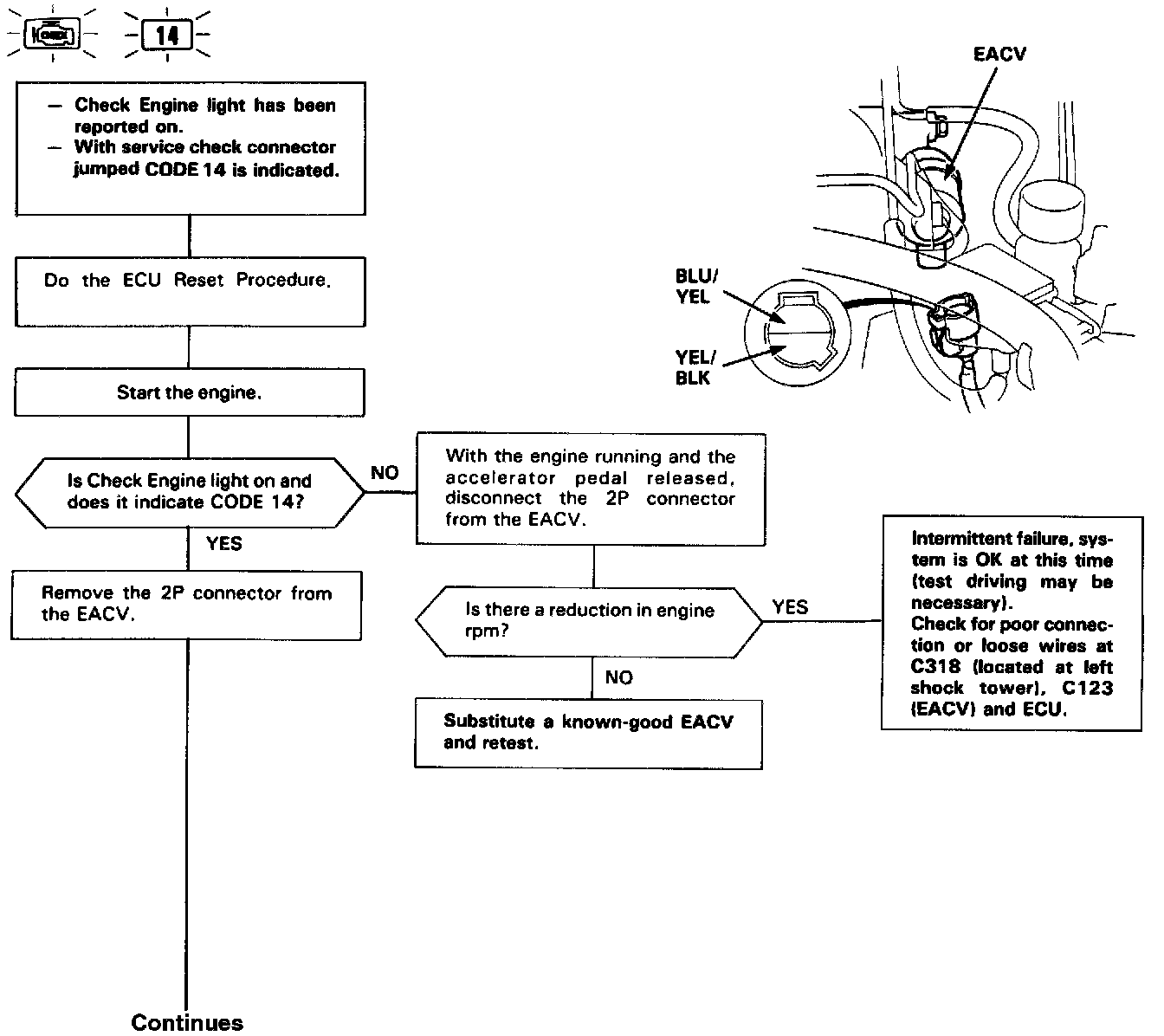 Self-diagnosis Check Engine light indicates code 14: A problem in the Electric Air Control Valve (EACV) Circuit.
