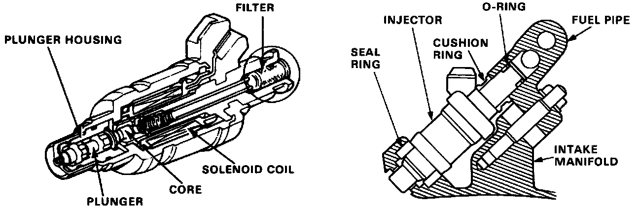 The injectors are a solenoid-actuated constant-stroke pintle type consisting of a solenoid, plunger needle valve and housing. When current is applied to the solenoid coil, the valve lifts up and pressurized fuel is injected. Because the needle valve lift and the fuel pressure are constant, the injection quantity is determined by the length of time that the valve is open (i.e.,the duration the current is supplied to the solenoid coil). The injector is sealed by an 0-ring and seal ring at the top and bottom. These seals also reduce operating noise.