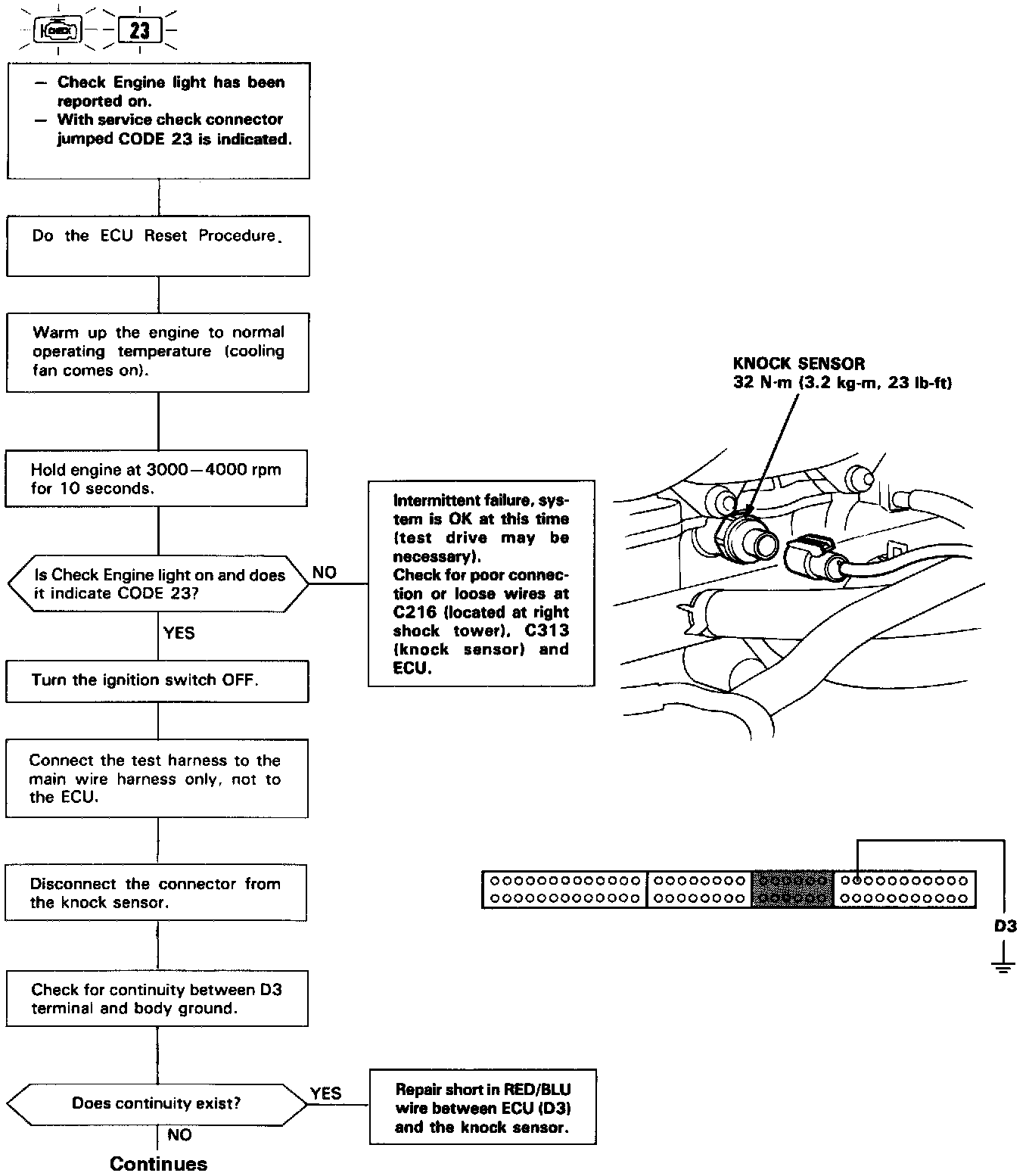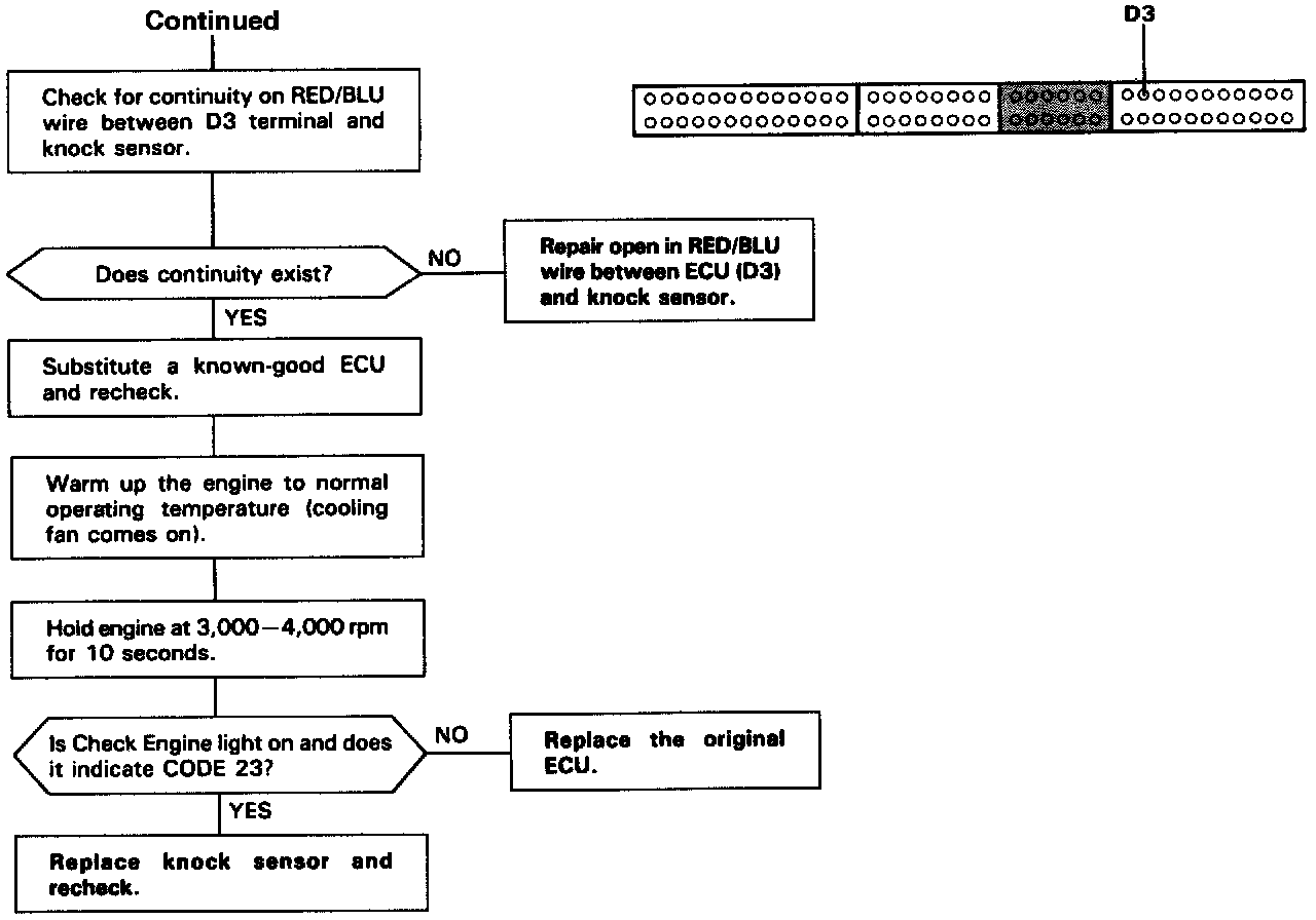 Self-diagnosis Check Engine light indicates code 23: A problem in the Knock Sensor circuit.