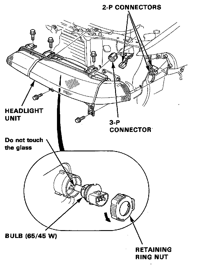 1. Disconnect the 3-P connector and 2-P connectors from the each bulb. Before disconnecting right side connector, remove the air cleaner case.