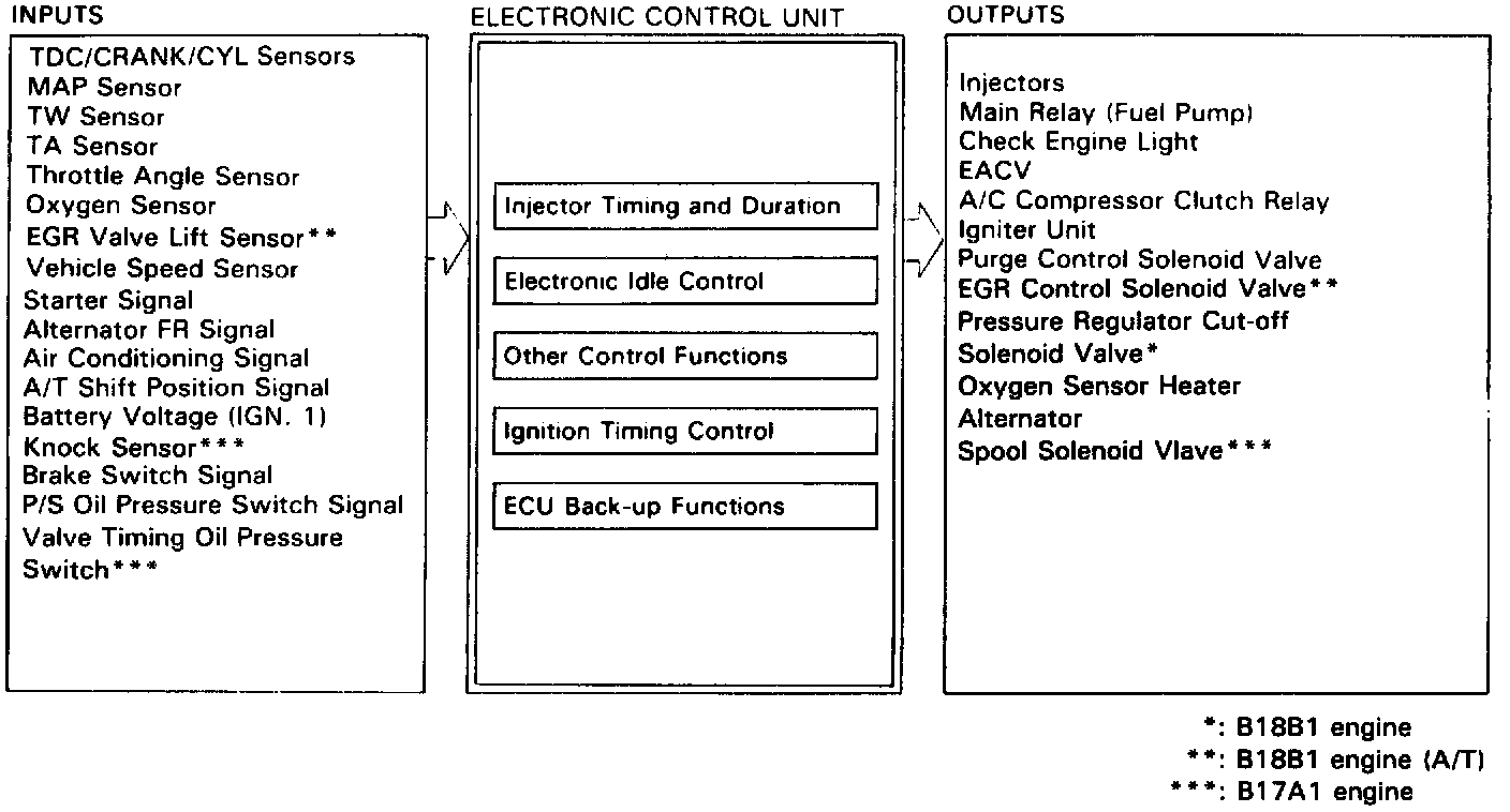 A Knock Control System is also used. When detonation is detected by the knock sensor, the ignition timing is retarded (B17A/engine).
