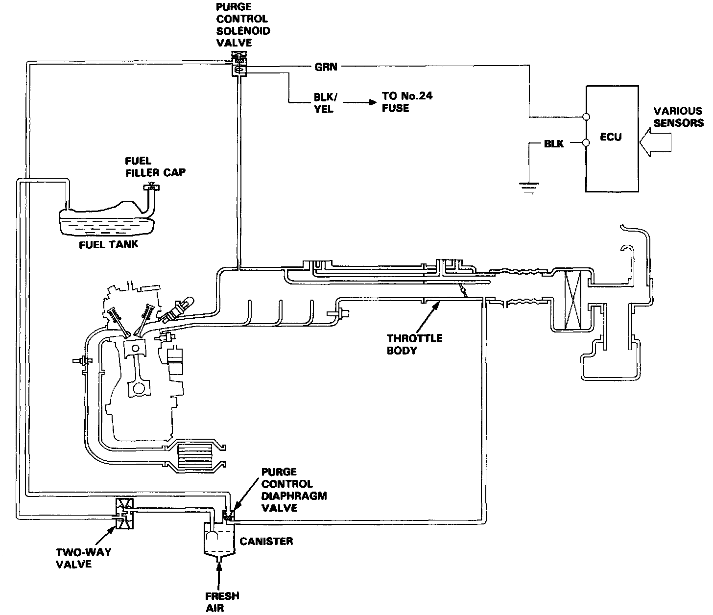Canister purging is accomplished by drawing fresh air through the Canister and into a port on the throttle body. The purging vacuum is controlled by the purge control diaphragm valve and the purge control solenoid valve.