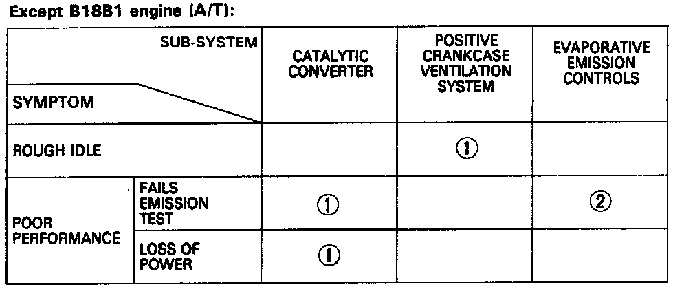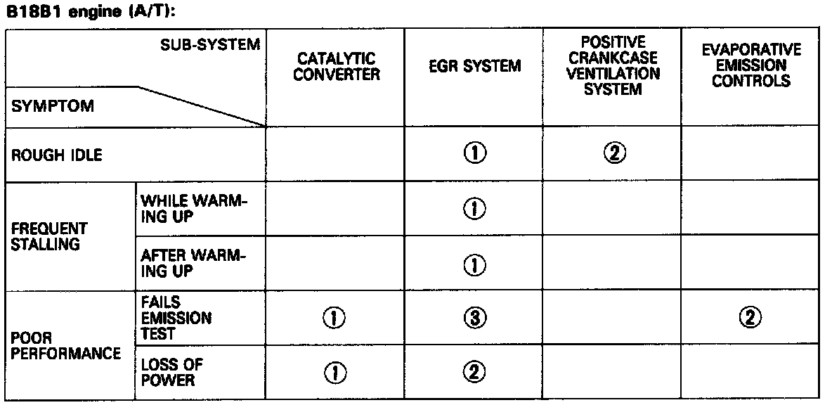 NOTE: Across each row in the chart, the sub-systems that could be sources of a symptom are ranked in the order they should be inspected starting with (1). Find the symptom in the left column, read across to the most likely source, then refer to the system or component listed at the top of that column. If inspection shows the system is OK, try the next most likely system (2), etc.