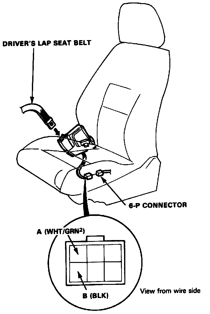 2. There should be continuity between the A (WHT/ GRN2) and B (BLK) terminals when the driver's lap seat belt is not buckled.