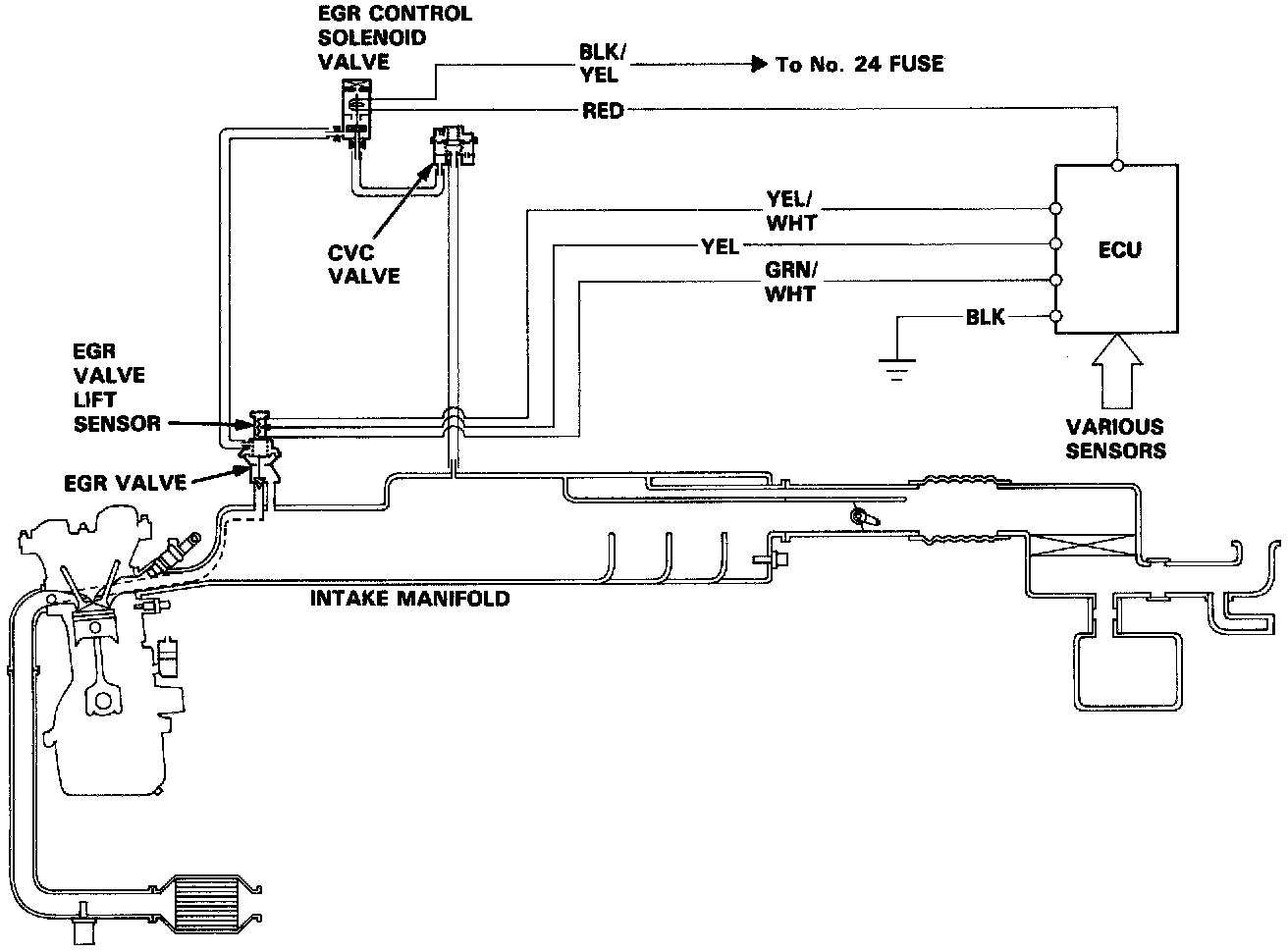 The EGR System is designed to reduce oxides of nitrogen emissions (NOx) by recirculating exhaust gas through the EGR valve and the intake manifold into the combustion chambers. It is comprised of the EGR valve, CVC valve, EGR control solenoid valve, ECU and various sensors.