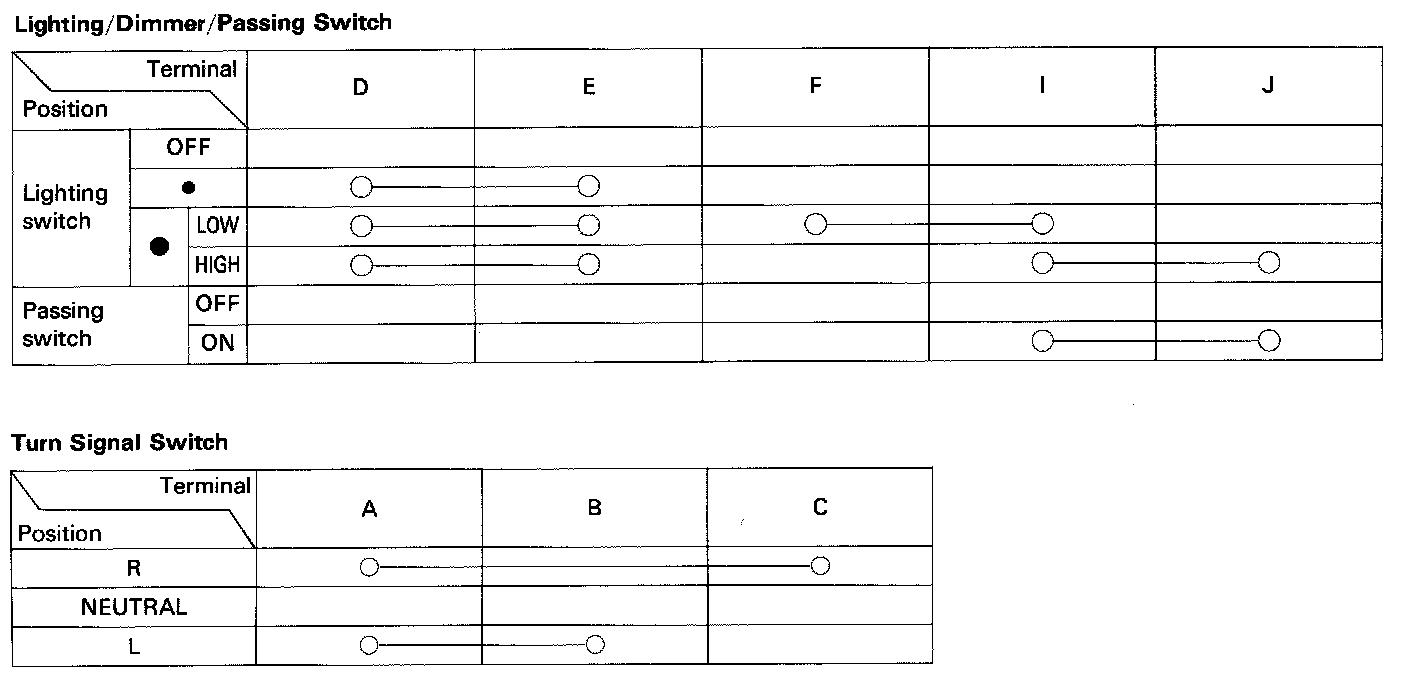 3. Check for continuity between the terminals in each switch position according to the tables.
