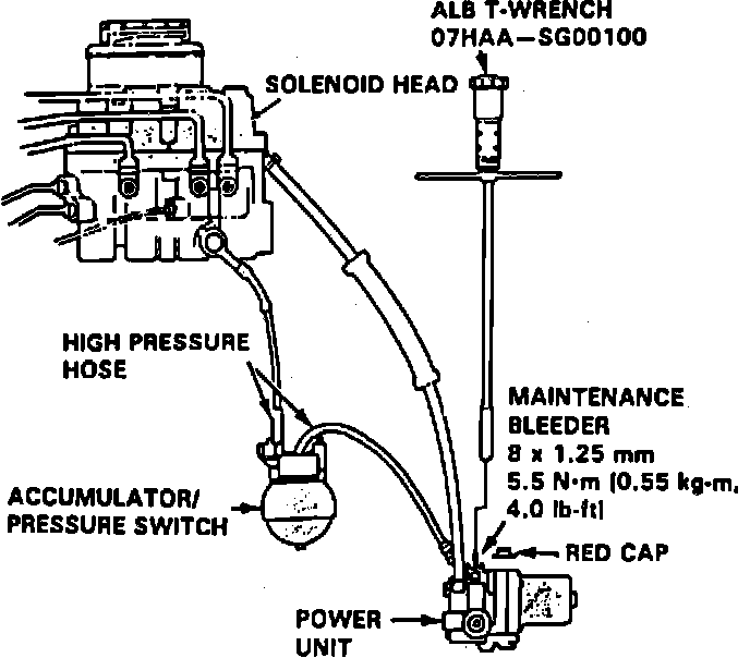 4. Using tool No. 07HAA-SG00100 or equivalent, bleed high pressure fluid from maintenance bleeder, Fig. 62 and 63. Do not reuse brake fluid.