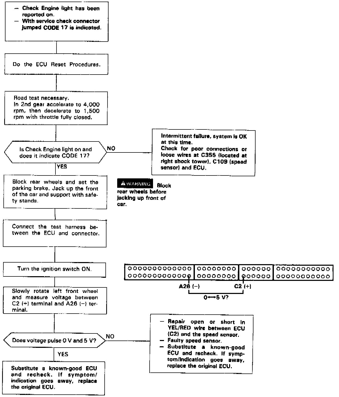 Self-diagnosis Check Engine light indicates code 17: A problem in the Vehicle Speed Sensor circuit.