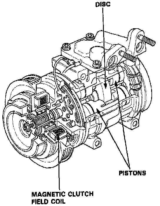 The compressor is a Nippondenso piston type. A revolving inclined disc drives the surrounding 10 reciprocating pistons. As the inclined disc revolves, it pushes the pistons, protected by a ceramic shoe, thus compressing the refrigerant.
