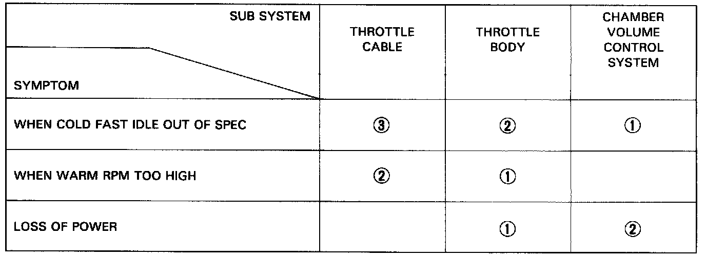NOTE: Across each row in the chart, the sub systems that could be sources of a symptom are ranked in the order they should be inspected starting with (1). Find the symptom in the left column, read across to the most likely source, then refer to the system or component listed at the top of that column. If inspection shows the system is OK, try the next system (2), etc.