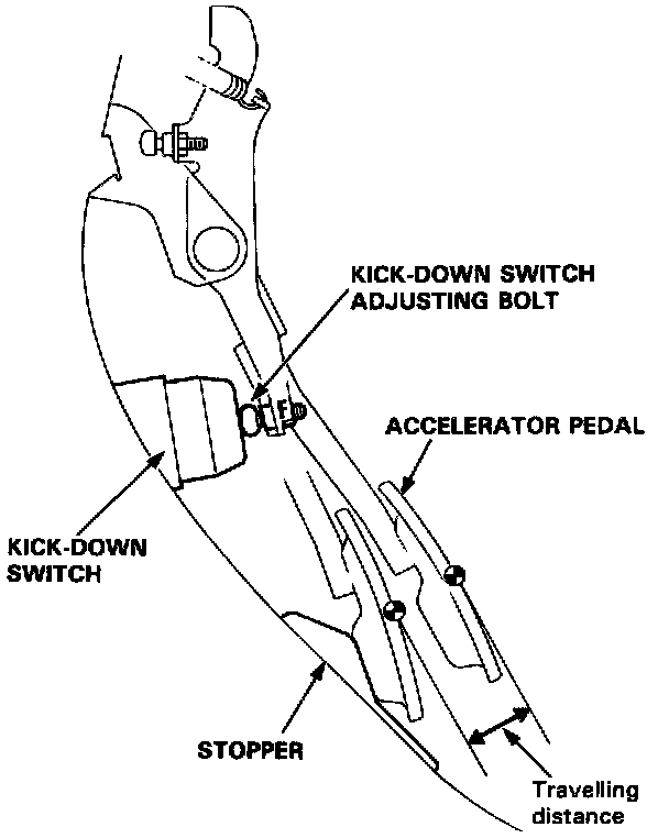 2. Adjust the length of the kick-down switch adjusting bolt so that the accelerator pedal travelling distance between the point where the bolt first contacts with the kick-down switch and the point where the accelerator pedal hits the stopper becomes the specified value.