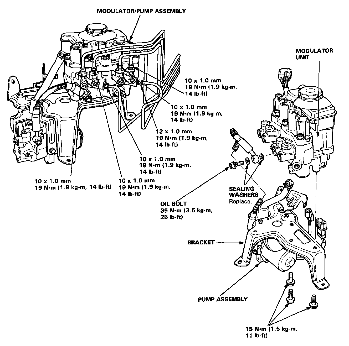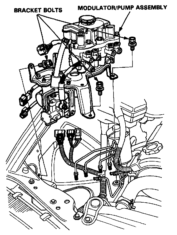 5. Remove the three modulator bracket bolts, then remove the modulator/pump assembly and bracket as an assembly.