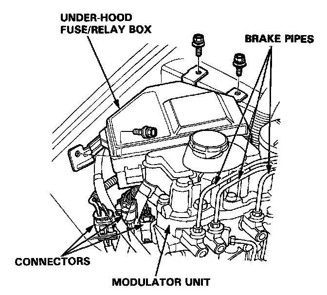 3. Remove the under-hood fuse/relay box mounting bolts and disconnect the connectors from the modulator unit.