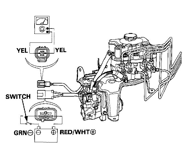 2. Attach the positive (+) lead of a fully charged 12 V battery to the RED/WHT terminal of the power unit motor connector and negative (-) lead to the GRN terminal, and install a switch between as shown.