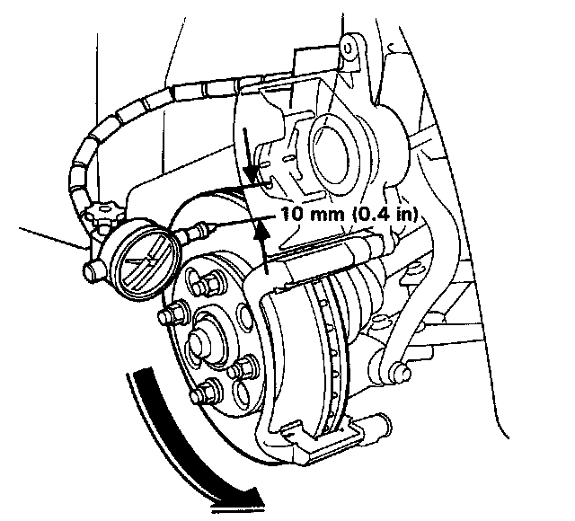 4. Use suitable nuts (12 x 1.5 mm) and plain washers to hold the disc securely against the hub, then mount a dial indicator as shown and measure the runout at 10 mm (0.4 in) in from the outer edge of the disc.