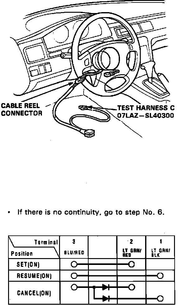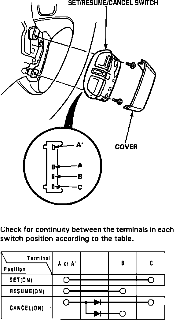 6. If there is continuity in each switch position, set/resume/cancel switch is functional. If there is no continuity in one or some switch positions, replace switch.