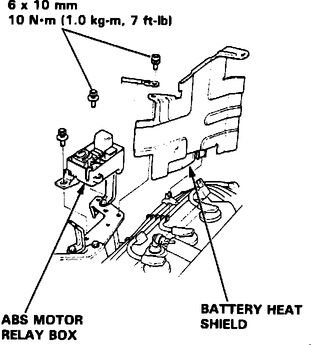 9. Remove ABS motor relay box, battery heat shield and battery, Fig. 10.