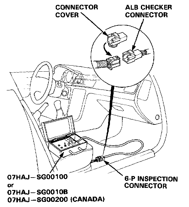 1. Disconnect the 6-P inspection connector from the cross-member under the passenger 5 seat and connect the inspection connector to the ALB checker.