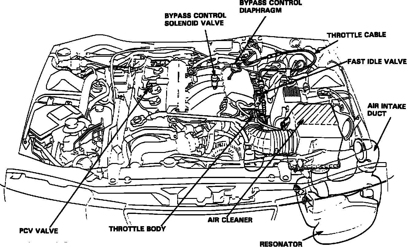 Intake Air Hoses are mounted in the engine compartment at various locations. Starting near the left headlight area, continuing across the top of the radiator, and over to the right side fender and shock tower. From that point it goes to the rear of the engine compartment where it connects to the throttle body assembly.
