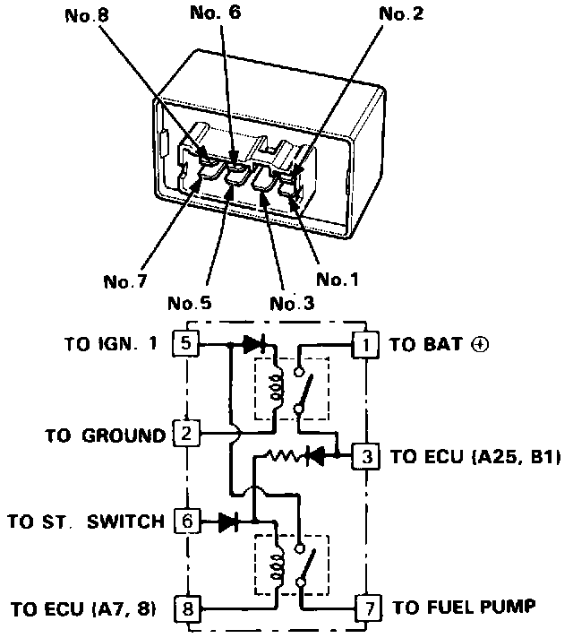 2. Attach the battery positive terminal to the No. 6 terminal and the battery negative terminal to the No. 8 terminal of the main relay. Then check for continuity between the No. 5 terminal and No. 7 terminal of the main relay.