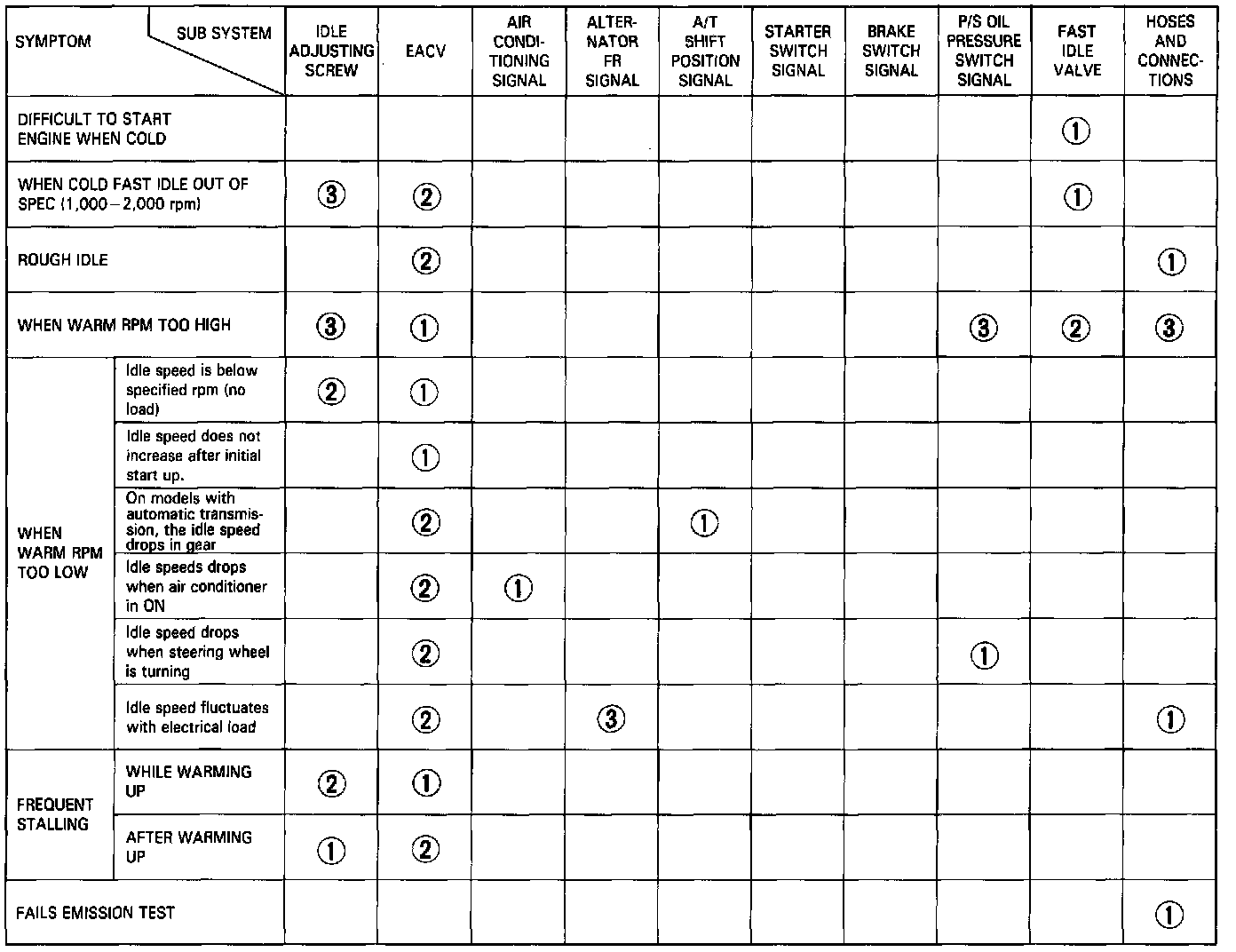 - Across each row in the chart, the sub systems that could be sources of a symptom are ranked in the order they should be inspected, starting with (1). Find the symptom in the left column, read across to the most likely source, then refer to the system or component listed at the top of that column. If inspection shows the system is OK, try the next system (2), etc.