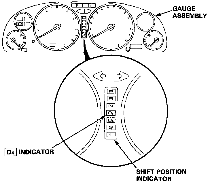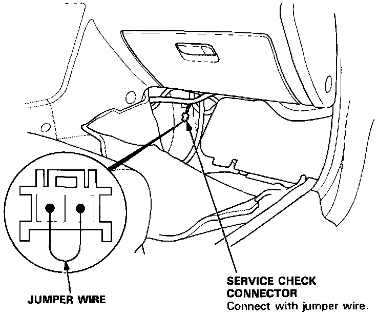 When the A/T control unit senses an abnormality in the input or output systems, the (D4) indicator light in the gauge assembly will blink. However, when the Service Check Connector (located under the dash on the passenger side) is connected with a jumper wire, the (D4) indicator light will blink the problem code when the ignition switch is turned on.