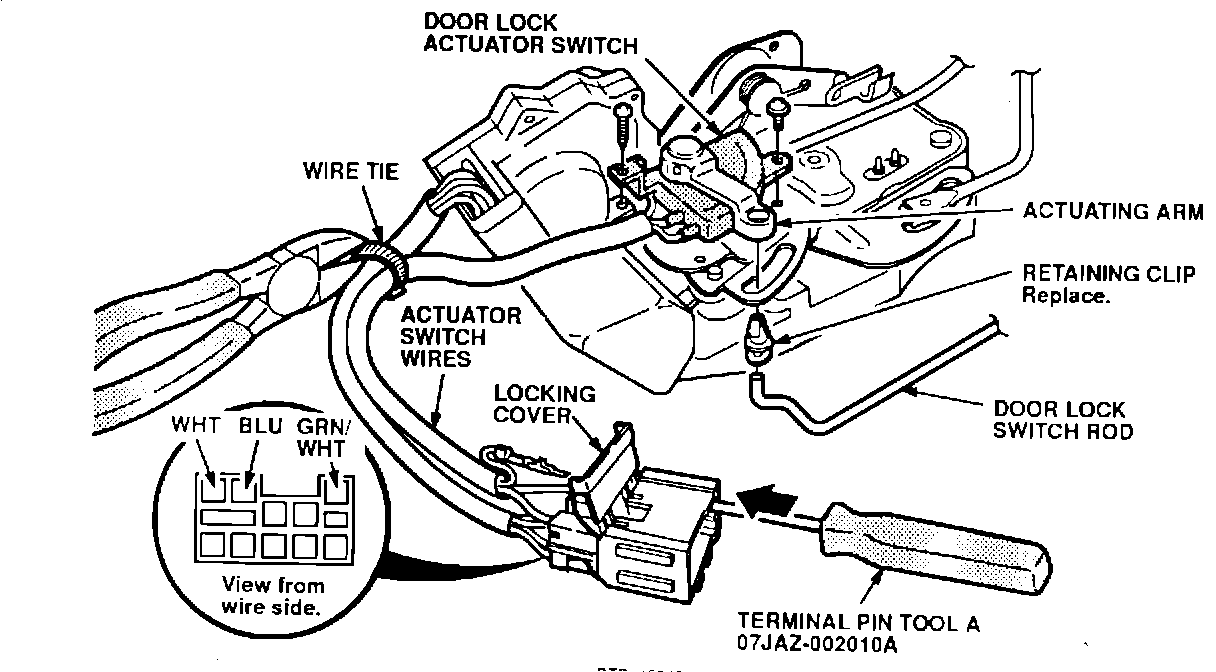 4. Install the new door lock actuator switch on the door latch. Use a new retaining clip when installing the door lock switch rod. Place a new wire tie around the two harnesses, and insert the wire terminals into the connector. Reinstall the locking cover.