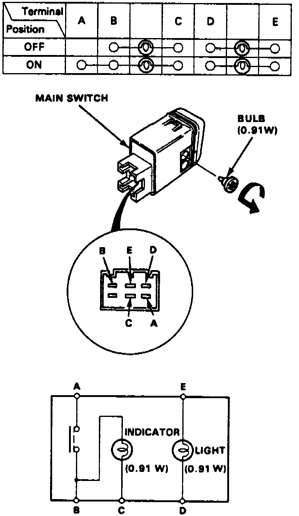 1. Remove switch from instrument panel and check for continuity between terminals as shown in Fig. 13.